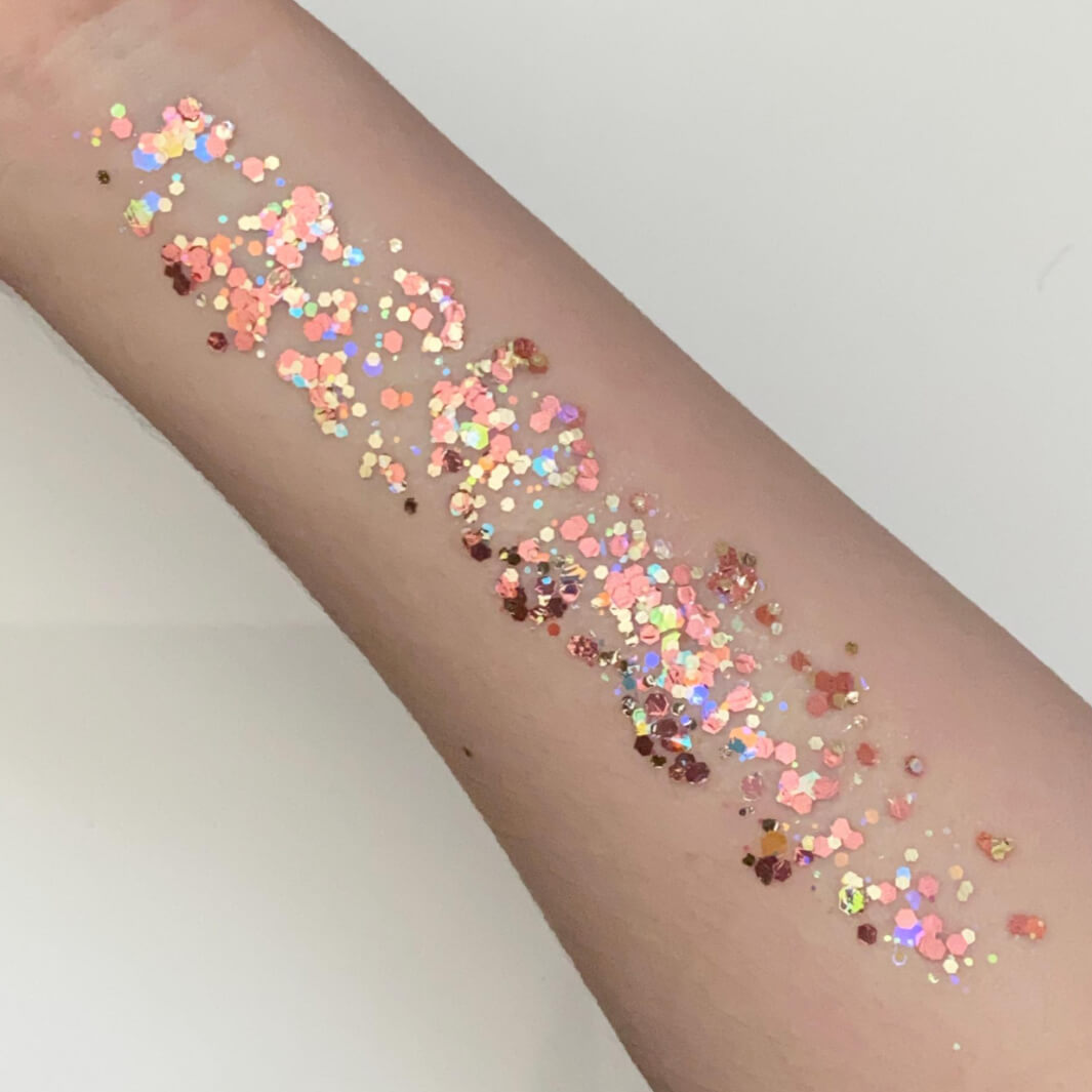 Prink Prosecco is a romantic gel glitter blend of chunky rose, gold, and holographic glitters, creating a warm, multidimensional shimmer. Its smooth, non-sticky formula glides effortlessly onto the skin, perfect for face and body art, festival looks, or adding a touch of glamour to any makeup creation. Made with FDA and EU-approved, skin-safe cosmetic-grade ingredients, a little goes a long way — so your 20ml jar will keep the sparkle shining beautifully.