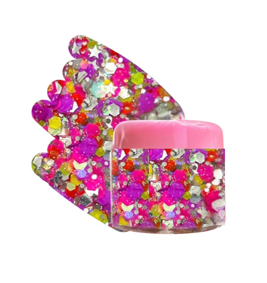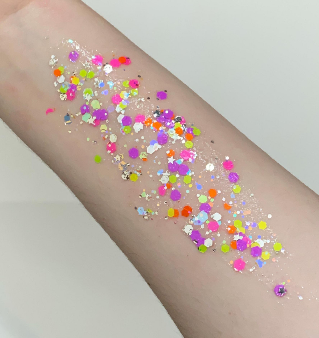 Valley Girl is a dazzling blend of chunky blacklight-reactive glitters mixed with silver and holographic sparkles for a bold, high-impact shine. Its smooth, skin-safe gel formula glides effortlessly onto the skin, perfect for festival looks, parties, and statement body art. Made with FDA and EU-approved cosmetic-grade ingredients, this glitter delivers maximum glow under UV light — and with just a small amount, you’ll shine all night long!